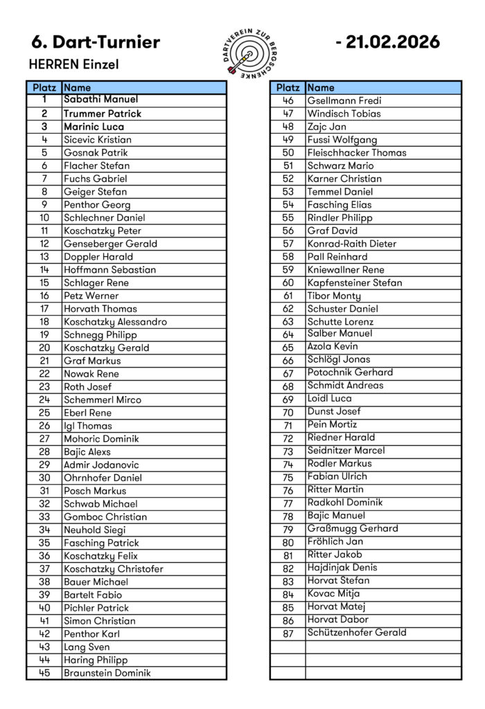 SABATHI MANUEL konnte seinen Turniersieg vom Vorjahr wiederholen und verteidigte sehr souverän seinen Titel. Im Finale ließ er dem Zweitplatzierten TRUMMER PATRICK keine Chance und verwertete seinen ersten Matchdart.